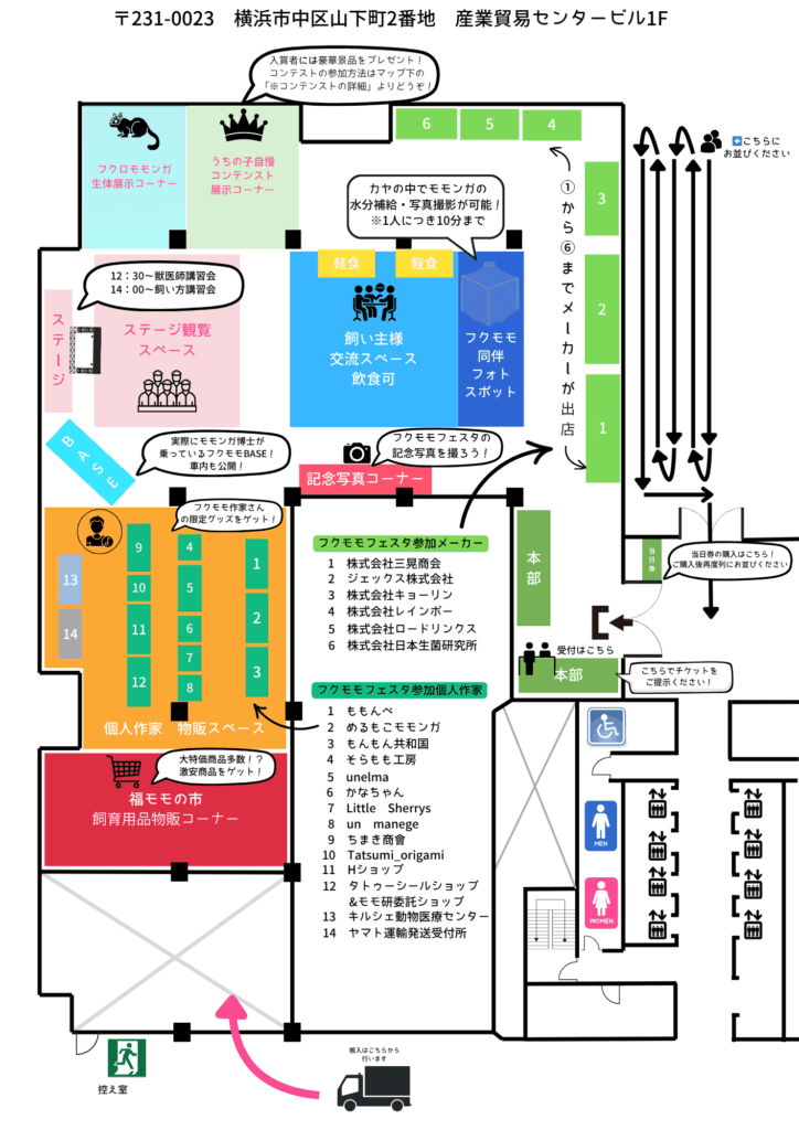 ⇒会場マップ ⇒イベント内容 ⇒タイムテーブル ⇒チケット ⇒アクセス ⇒よくある質問 ⇒お問い合わせ News 新着情報 本日は『フクモモフェスタ001 in 横浜』にご来場いただき、誠にありがとうございました。多くの飼い主さま、メーカーさま、獣医師の先生方、個人作家の皆さまのご協力により、無事に開催を終えることができました。… pic.twitter.com/quhx9vdh7M— フクモモフェスタ【公式】 (@fukumomofesta) October 5, 2025 【フクモモフェスタイベント情報】〝フクモモフェスタの公式Xを開設致しました!〟イベントの最新情報や出店者紹介、当日の見どころなどを随時発信していきます!ぜひフォローして、フクモモフェスタをもっと楽んでくださいね!▼フクモモフェスタ公式Xはこちらhttps://t.co/siAWiPvVwe pic.twitter.com/tqlFiImb9w— モモンガ博士 (@fukumomohakase) July 19, 2025 本日は『フクモモフェスタ001 in 横浜』にご来場いただき、誠にありがとうございました。多くの飼い主さま、メーカーさま、獣医師の先生方、個人作家の皆さまのご協力により、無事に開催を終えることができました。… pic.twitter.com/quhx9vdh7M— フクモモフェスタ【公式】 (@fukumomofesta) October 5, 2025 【フクモモフェスタイベント情報】〝フクモモフェスタの公式Xを開設致しました!〟イベントの最新情報や出店者紹介、当日の見どころなどを随時発信していきます!ぜひフォローして、フクモモフェスタをもっと楽んでくださいね!▼フクモモフェスタ公式Xはこちらhttps://t.co/siAWiPvVwe pic.twitter.com/tqlFiImb9w— モモンガ博士 (@fukumomohakase) July 19, 2025 Map Map 会場マップ(変更の可能性があります) 会場マップ ※うちの子自慢コンテンストの詳細 ※フクモモの同伴方法についてはこちら ※上大岡キルシェ動物医療センターの便検査についてはこちら Event イベント内容 Event イベント内容 Event イベント内容 飼い方講習会 ももんが博士のフクモモ飼い方講習会を行います。テーマは『フクロモモンガとのスキンシップの方法』です! ももんが博士のプロフィールはこちら 獣医師講習会 上大岡キルシェ動物医療センターの山下院長によるフクロモモンガの講習会を行います。 獣医師のプロフィールはこちら 商品のサンプル配布 メーカーによる商品説明及びサンプルの配布を行います。この機会に商品サンプルをゲット! 参加メーカーはこちらから 飼い主様同士の交流会! 飲食スペースにて飼い主様同士が交流できるスペースを用意しました! うちの子バッジをつけて交流会に参加しよう! 交流会の詳細はこちら 福モモの市開催! フクロモモンガ研究所のオリジナルグッズ及びメーカー商品が大特価にて販売します! 普段使う日用品を大特価でゲット! 研究所の商品はこちら フクモモ個人作家さん即売会! フクロモモンガの個人作家さんが大集合! 限定品をゲット! 出店個人作家の詳細はこちら Gest ゲスト紹介 Festa MC:日乃まそらさん 講習会講師:山下智之院長 日乃まそらさんのプロフィールはこちら Gest ゲスト紹介 Festa MC:日乃まそらさん 日乃まそらさんのプロフィールはこちら 講習会講師:山下智之院長 Time table Time table タイムテーブル ticket ticket チケット 入場料 前売り券 1400円 当日券 1600円 ※小学生以下は無料 ※当日券は現金支払いのみの対応 細長ボタン 入場券を購入する>> ※小学生以下は無料 ※当日券は現金支払いのみの対応 細長ボタン 入場券を購入する>> Access アクセス [開催日時と場所] 開催日時:2025年10月5日(日)11時から16時 開始場所:横浜産貿ホール マリネリア ⇒https://www.yokohama-sanbohall.com/ 住所 〒231-0023 神奈川県横浜市中区山下町2 お車でお越しの方 首都高速「横浜公園ランプ」から約5分 電車での行き方 みなとみらい線「日本大通り駅」3番出口 徒歩5分JR・横浜市営地下鉄「関内駅」 南口 徒歩約15分 メインスポンサー 支援者名簿 クラウドファンディング、フクロモモンガの業界を繋ぐイベント『フクモモフェスタ』を開催したい!にご支援いただきありがとうございます。ご支援者様のご紹介をさせていただきます Access アクセス アクセス [開催日時と場所] 開催日時:2025年10月5日(日)11時から16時 開始場所:横浜産貿ホール マリネリア ⇒https://www.yokohama-sanbohall.com/ 住所 〒231-0023 神奈川県横浜市中区山下町2 お車でお越しの方 首都高速「横浜公園ランプ」から約5分 電車での行き方 みなとみらい線「日本大通り駅」3番出口 徒歩5分JR・横浜市営地下鉄「関内駅」 南口 徒歩約15分 gallery メインスポンサー 支援者名簿 支援者名簿 クラウドファンディング、フクロモモンガの業界を繋ぐイベント『フクモモフェスタ』を開催したい!にご支援いただきありがとうございます。ご支援者様のご紹介をさせていただきます Question Question よくある質問 Q. フクロモモンガの同伴はできますか? A. フクロモモンガの同伴方法はこちらのリンクからどうぞ。 👉 フクロモモンガの同伴方法はこちら Q. 雨天時でもイベントはありますか? A. 今回は室内のため雨天でも開催致します。 Q. 電子チケットはどのように提示すれ
