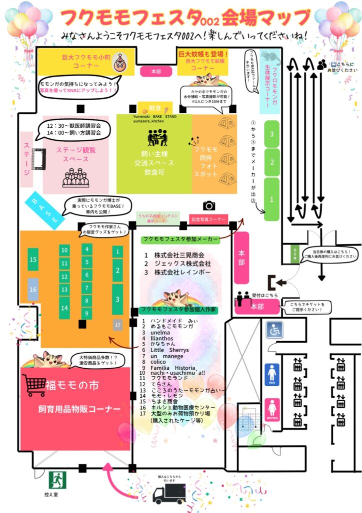 ⇒会場マップ ⇒イベント内容 ⇒タイムテーブル ⇒チケット ⇒アクセス ⇒よくある質問 ⇒お問い合わせ News 新着情報 【フクモモフェスタ002イベント情報】〝フクモモフェスタ出店個人作家さんが決定!〟5月3日開催の『フクモモフェスタ002』の出店個人作家さんが決定致しました!!📷︎ 出店作家様[ハンドメイドみぃ]https://t.co/JHhRUAGyCu[めるもこモモンガ]https://t.co/IwAMIfF143[unelma]… pic.twitter.com/5h4L3vAKNv— フクモモフェスタ【公式】 (@fukumomofesta) April 3, 2026 【フクモモフェスタ002最新情報】 \うちの子自慢コンテスト開催決定📸✨/ あなたの“うちの子”が主役になるチャンス! 📍ももんが博士賞(1名) 📍フクモモフェスタ賞(3名) 受賞者には豪華景品をプレゼント🎁 💡応募写真はすべて会場にて展示します! ※提示する写真は応募要件を満たしている写真に限ります。 ⏰応募締切:4月20日 みんなで自慢のモモンガを披露しよう🪄 ▼詳細・応募はこちら 【フクモモフェスタ002イベント情報】〝フクモモフェスタ出店個人作家さんが決定!〟5月3日開催の『フクモモフェスタ002』の出店個人作家さんが決定致しました!!📷︎ 出店作家様[ハンドメイドみぃ]https://t.co/JHhRUAGyCu[めるもこモモンガ]https://t.co/IwAMIfF143[unelma]… pic.twitter.com/5h4L3vAKNv— フクモモフェスタ【公式】 (@fukumomofesta) April 3, 2026 【フクモモフェスタ002最新情報】 \うちの子自慢コンテスト開催決定📸✨/ あなたの“うちの子”が主役になるチャンス! 📍ももんが博士賞(1名) 📍フクモモフェスタ賞(3名) 受賞者には豪華景品をプレゼント🎁 💡応募写真はすべて会場にて展示します! ※提示する写真は応募要件を満たしている写真に限ります。 ⏰応募締切:4月20日 みんなで自慢のモモンガを披露しよう🪄 ▼詳細・応募はこちら Map Map 会場マップ(変更の可能性があります) 会場マップ ※うちの子自慢コンテンストの詳細 ※フクモモの同伴方法についてはこちら ※上大岡キルシェ動物医療センターの便検査についてはこちら Event イベント内容 Event イベント内容 Event イベント内容 飼い方講習会 ももんが博士のフクモモ飼い方講習会を行います。テーマは『フクロモモンガの気持ちになってみよう』です! ももんが博士のプロフィールはこちら 獣医師講習会 上大岡キルシェ動物医療センターの山下院長によるフクロモモンガの講習会を行います。 獣医師のプロフィールはこちら 商品のサンプル配布 メーカーによる商品説明及びサンプルの配布を行います。 この機会に商品サンプルをゲット! 参加メーカーの詳細はこちら 飼い主様同士の交流会! 飲食スペースにて飼い主様同士が交流できるスペースを用意しました! うちの子ホルダーをつけて交流会に参加しよう! 交流会の詳細はこちら 福モモの市開催! フクロモモンガ研究所のオリジナルグッズ及びメーカー商品を大特価にて販売します! 普段使う日用品を大特価でゲット! 研究所の商品はこちら フクモモ作家さん即売会! フクロモモンガの作家さんが大集合! 限定品をゲット! 個人作家一覧はこちら Gest ゲスト紹介 Festa MC:日乃まそらさん 講習会講師:山下智之院長 日乃まそらさんのプロフィールはこちら 山下智之院長のプロフィールはこちら Gest ゲスト紹介 Festa MC:日乃まそらさん 日乃まそらさんのプロフィールはこちら 講習会講師:山下智之院長 山下院長のプロフィールはこちら ticket ticket チケット 入場料 前売り券 1400円 当日券 1600円 ※小学生以下は無料 ※当日券は現金支払いのみの対応 細長ボタン 入場券を購入する>> フクモモ同伴チケット フクモモの同伴を希望の方は以下のリンクよりどうぞ※安全と管理面を考え同伴モモンガは100匹限定です 細長ボタン フクモモ同伴チケットを購入する>> ※小学生以下は無料 ※当日券は現金支払いのみの対応 細長ボタン 入場券を購入する>> フクモモ同伴チケット フクモモの同伴を希望の方は以下のリンクよりどうぞ※安全と管理面を考え同伴モモンガは100匹限定です 細長ボタン フクモモ同伴チケットを購入する>> Access アクセス [開催日時と場所] 開催日時:2026年5月3日(日)11時から16時 開始場所:横浜産貿ホール マリネリア ⇒https://www.yokohama-sanbohall.com/ 住所 〒231-0023 神奈川県横浜市中区山下町2 お車でお越しの方 首都高速「横浜公園ランプ」から約5分※当日会場周辺でパレードが行われる予定です。交通規制がありますのでこちらをご確認ください↓https://www.yokohama-cci.com/detail/index.html 電車での行き方 みなとみらい線「日本大通り駅」3番出口 徒歩5分JR・横浜市営地下鉄「関内駅」 南口 徒歩約15分 メインスポンサー 支援者名簿 クラウドファンディング、フクロモモンガの業界を繋ぐイベント『フクモモフェスタ』を開催したい!にご支援いただきありがとうございます。ご支援者様のご紹介をさせていただきます Access アクセス アクセス [開催日時と場所] 開催日時:2026年5月3日(日)11時から16時 開始場所:横浜産貿ホール マリネリア ⇒https://www.yokohama-sanbohall.com/ 住所 〒231-0023 神奈川県横浜市中区山